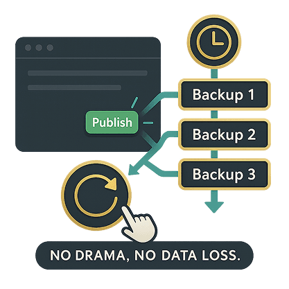 Every time we publish a change, a fresh backup is created automatically. Need to roll back? One click and you’re restored—no drama, no data loss.